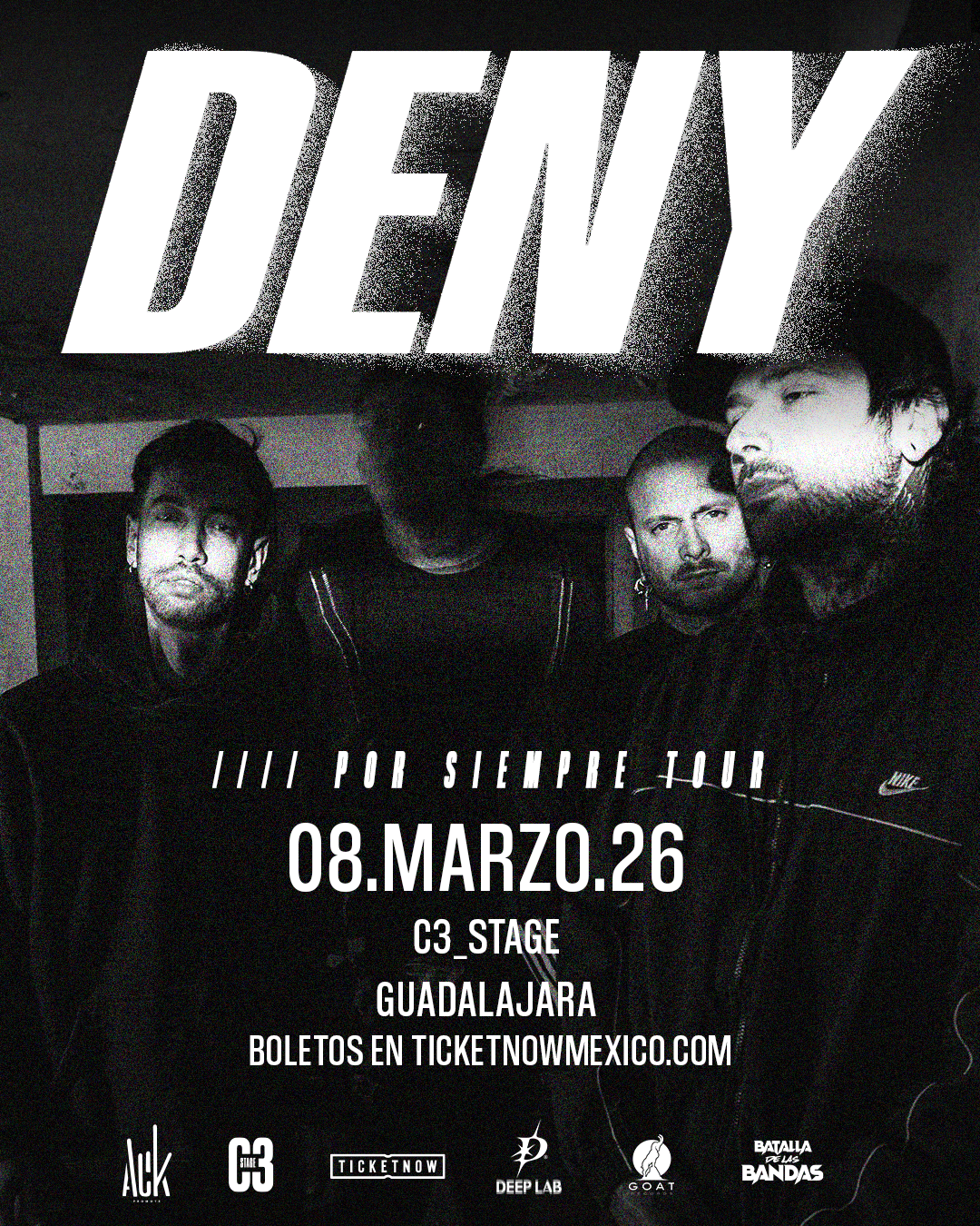 Con una mezcla post-hardcore y metalcore, con letras intensas y una energía que debe experimentarse en vivo, Deny retoma su lugar en los escenarios para nuevamente ofrecer conexión total. Si creciste entre breakdowns, riffs intensos y emoción real, sabes que este tour será historia.